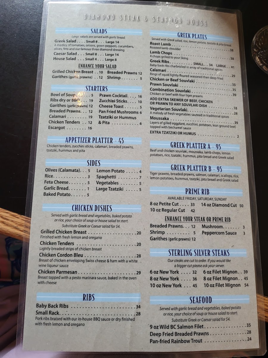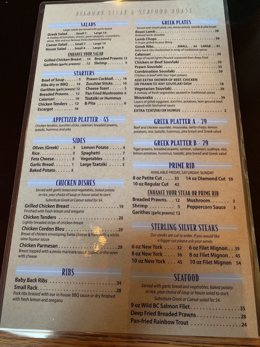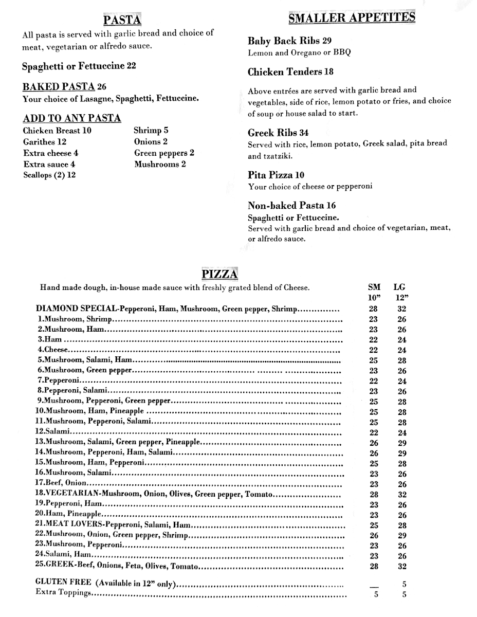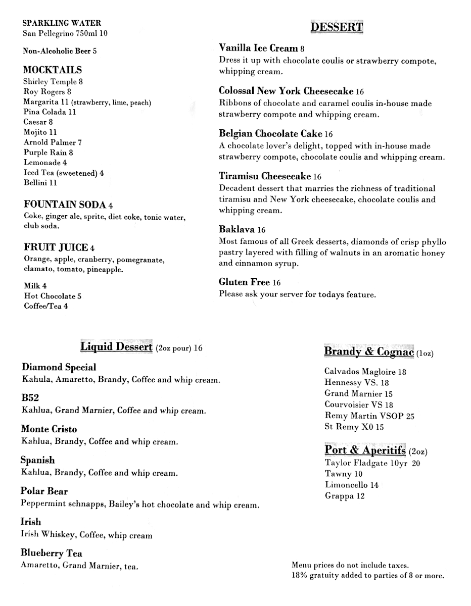 The menu at Diamond Steak & Seafood House offers a balanced blend of Greek and Italian influences with a focus on fresh, quality seafood and hearty steakhouse favorites. Designed to cater to both relaxed dinners and special occasions, the selection is approachable yet varied, from classic Mediterranean dishes like Chicken Souvlaki and Moussaka to robust cuts such as the 10-ounce New York steak and prime rib.